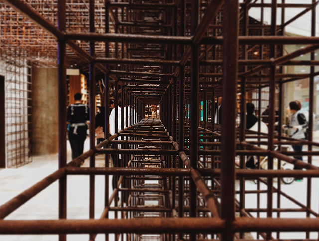门外,从通透的玻璃门可看见密密麻麻的钢铁林立,形成一个狭窄的入口。穿过“钢铁森林”往前走,视野突然开阔起来,一颗由钢筋缠绕而成的粗壮树干映入眼帘,周边层层书架鳞次栉比,给人一种恢弘磅礴之感。 这景象,让我想起《桃花源记》里所描述的:“初极狭,才通人。复行数十步,豁然开朗。”