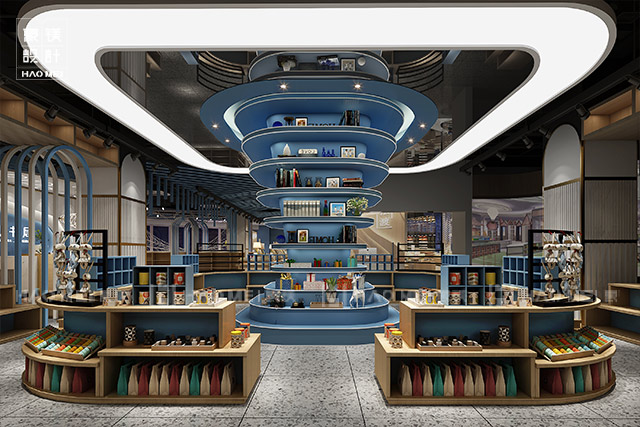 小件商品的管理。其背景墙以蓝白两色及浮动