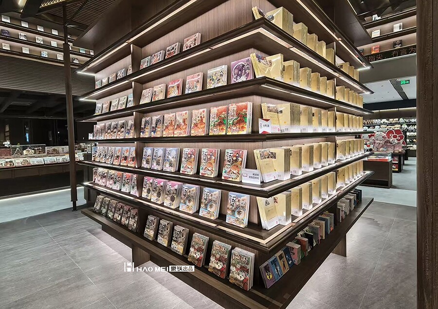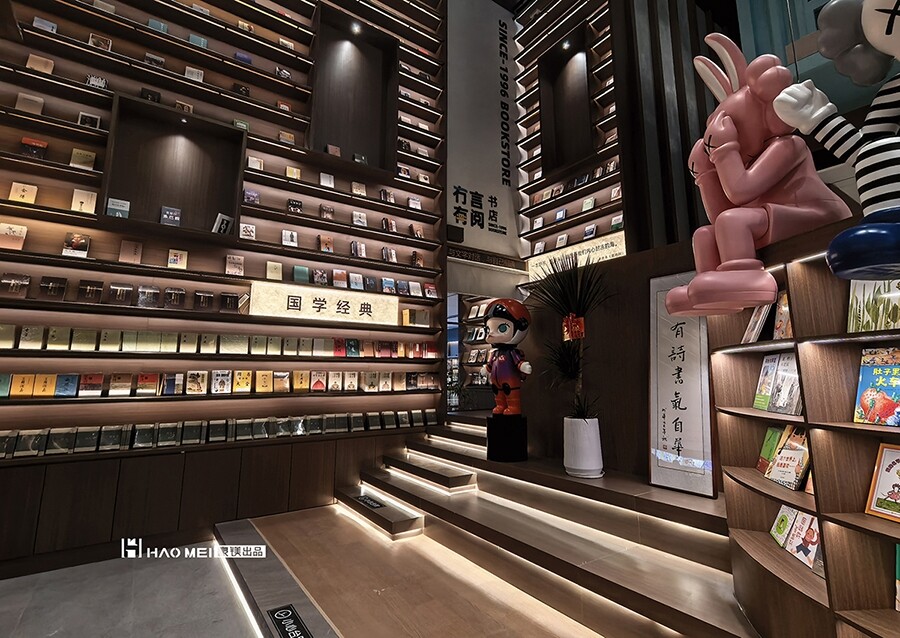 • 功能设计:阶梯式展示台、多层错落陈列、开放式与封闭式结合,满足不同尺寸与类型书籍的展示需求;部分书架顶部嵌入射灯,强化书脊文字的可读性与视觉层次。