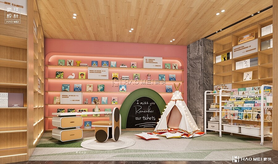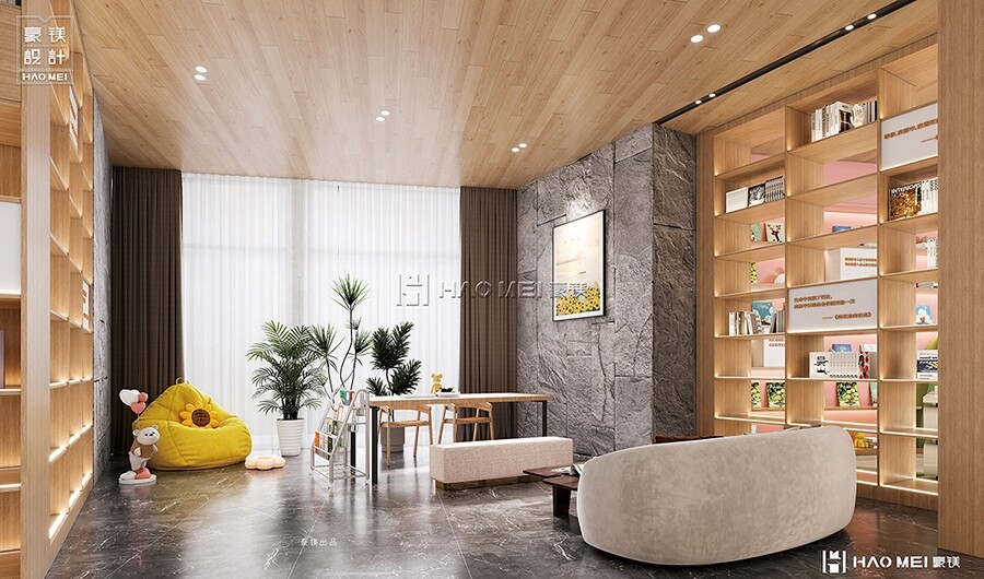 灯光设计:灯光是空间的化妆师。豪镁采用了基础照明、重点照明与氛围照明相结合的多层次灯光方案。天花板的嵌入式射灯提供均匀的基础光线;书架内的背光灯带不仅便于找书,更凸显了书籍的陈列美感;而各区域精心设置的点位光源,如舞台射灯、木屋内的暖光吊灯,则精准地烘托了特定区域的氛围,共同编织出一个温暖、静谧而有情感张力的光环境。