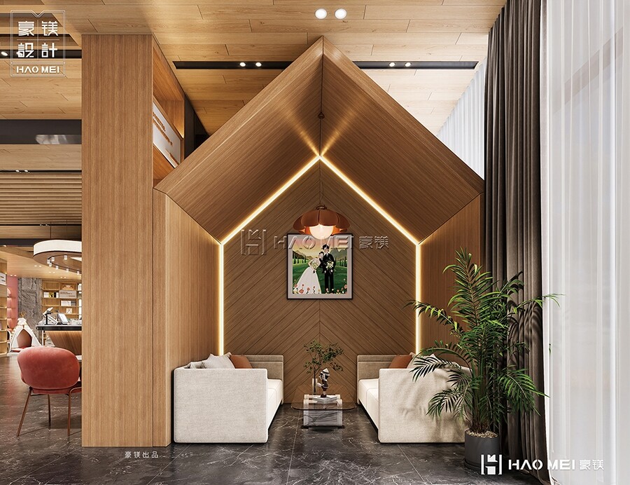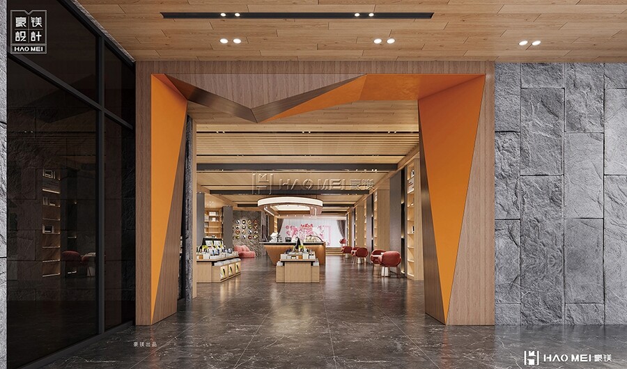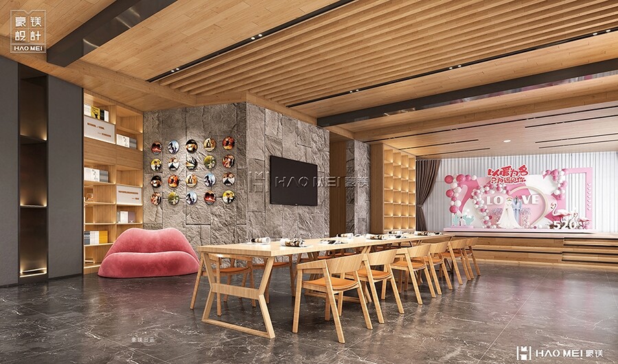 色彩是空间的情绪语言。豪镁在此案中采用了高级灰与暖木色作为空间基底,营造出沉稳、宁静且富有质感的背景,犹如爱情的坚实土壤与温暖怀抱。在此基础上,爱马仕橙与柔粉色作为点睛之笔跳跃而出。橙色赋予空间现代感与活力,吸引年轻客群;粉色则渲染出甜蜜、梦幻的氛围,直击主题。在材质上,天然木材的温润、灰色石材的冷峻、金属的精致以及玻璃的通透,形成了丰富的质感碰撞。这种碰撞不仅提升了空间的美学层次,更隐喻了爱情中细腻、复杂而深刻的情感维度,让空间本身成为一首关于爱的立体诗篇。