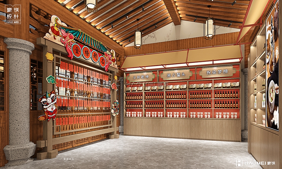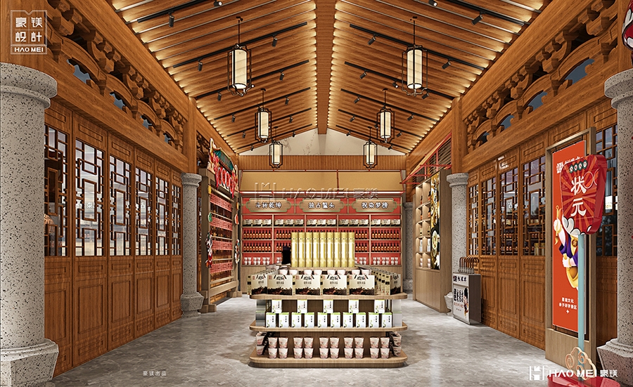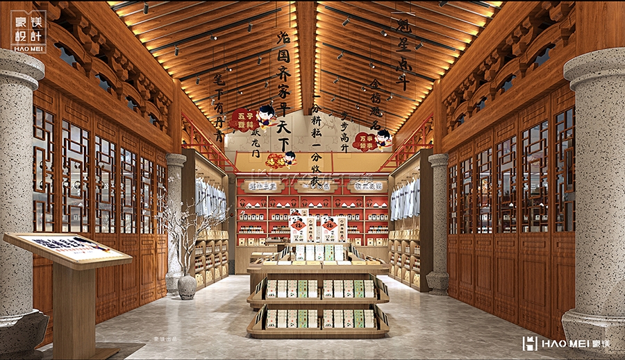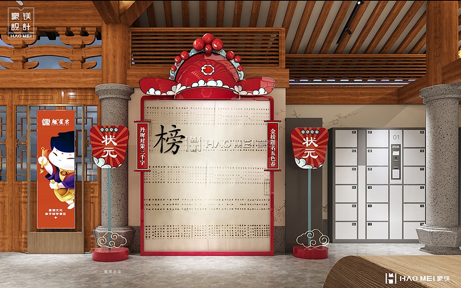 紧邻的“状元榜签名处&寄存处”则是情绪互动的关键节点。不同于常规寄存柜的机械感,方案将其与“金榜题名”的文化意象结合:签名墙以宣纸质感为底,搭配朱砂色印章元素,访客留下姓名的同时,自然代入“参与书院文化传承”的仪式感;寄存区则通过半开放木质格栅分隔,既保证私密性,又保留空间通透感,避免传统储物区给人带来的疏离体验。