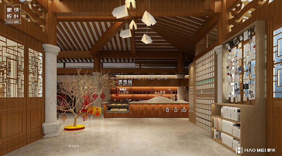 文化消费与休闲功能的融合更具巧思:特产与香火区被规划在动线两侧,既满足访客“带一份文化记忆离开”的需求(如地方非遗手信、书院主题文创),又通过香火区的设置延续传统书院的祈福文化——但区别于粗放的香烛售卖,方案中采用电子香炉与线香组合的形式,在环保与体验间找到平衡。文创售卖区则与“书想所”阅读空间相邻,形成“可买可读”的联动:游客选购文创后,可直接进入隔壁的阶梯阅读区翻阅相关书籍,深化对文化符号的理解。