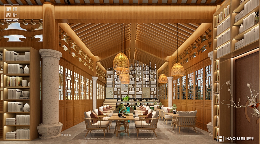 首层的核心记忆点落在“书想所”复合区域——它并非传统书店的简单复刻,而是通过“前台(服务)-文创区(展示)-休闲咖啡(停留)-阶梯阅读区(深度体验)”的四段式设计,构建了一个“可逛、可坐、可读”的立体场域。前台采用原木色与青砖纹理结合的柜台设计,呼应书院建筑基调;文创区陈列架高度控制在1.2米以下,避免视觉压迫,重点展示与书院相关的文房四宝、线装笔记本等实用型文创;休闲咖啡区设置靠窗卡座,窗外预留景观视口(后续可引入庭院绿植),让访客在咖啡香气中自然放松;最值得关注的是阶梯阅读区——它既是展厅与阅读区的过渡空间,也是小型文化活动的灵活场地(如读书分享会、非遗手作体验课),阶梯的错落设计既保证视线通透,又为不同需求的访客提供了“站着翻阅”或“坐着沉浸”的选择。