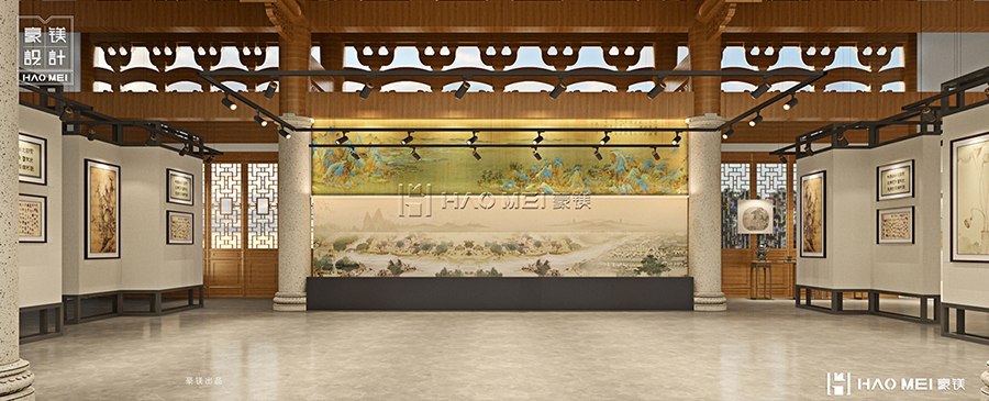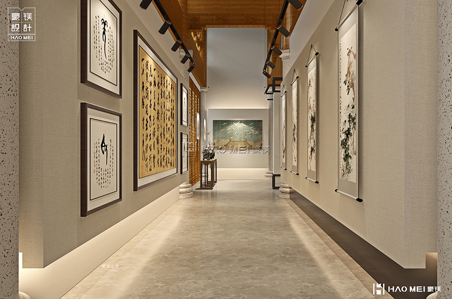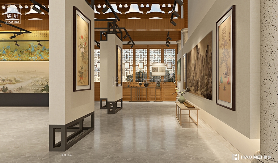 书画展厅的序列化布局同样体现用心:三个展厅(展厅1-3)沿动线依次排布,但并非简单的“展墙+画框”模式。方案中通过灯光分层(主光源打亮画作、辅助光渲染墙面背景)、展陈密度控制(每幅作品预留1.5米观赏距离)、地面材质区分(展厅入口用青石板铺地,内部切换为木质地板)等方式,营造出“移步换景”的观展节奏。尤其值得注意的是,展厅与书想所之间未设置硬质隔断,而是通过镂空书架墙过渡——既保证了空间的连通性,又让访客在观展后能自然走向阅读区,查阅相关艺术典籍,形成“看展-思考-延伸阅读”的闭环体验。