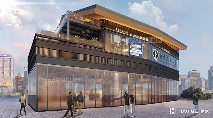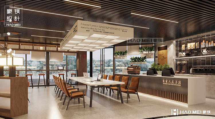 豪镁经过推敲、提取当地特色元素的诗意蓝本,似乎连门头都仿佛在和我们对话。整个门头透过半透明幕墙,客人可以看见窗外楼下川流不息的往来人群,在相对安静、私密的空间中享受有茶有咖啡相伴的休憩时光。