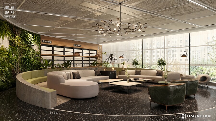点缀色: 运用企业色(如奥普品牌色)或温和的亮色(如图6的绿色座椅)于家具、标识或局部墙面,增加活力与辨识度。