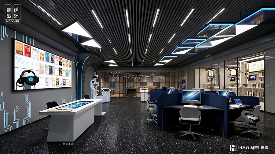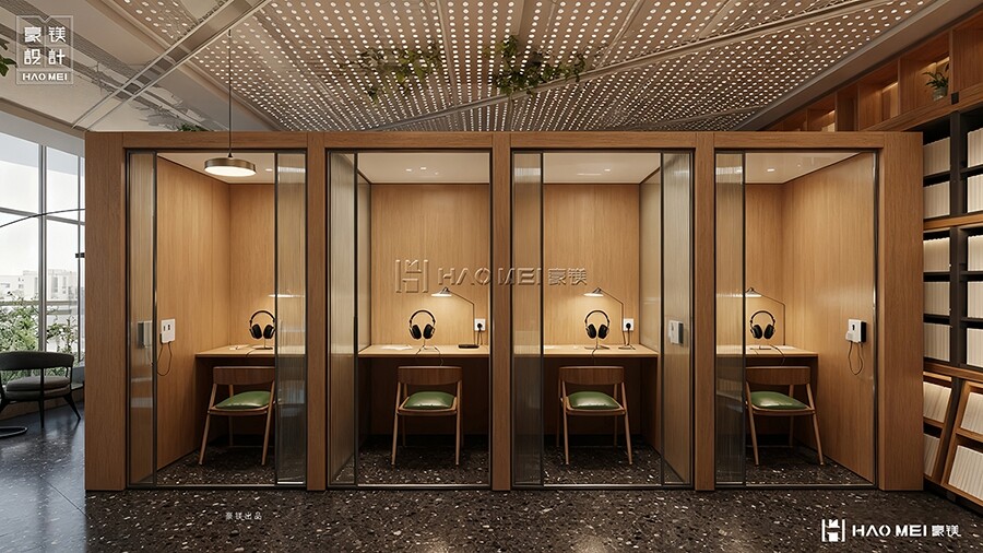 数字体验区/电子阅览区(参考图10的办公隔间): 配备高性能电脑、专业数据库、多媒体制作设备,支持数字阅读、音视频编辑、在线课程学习。