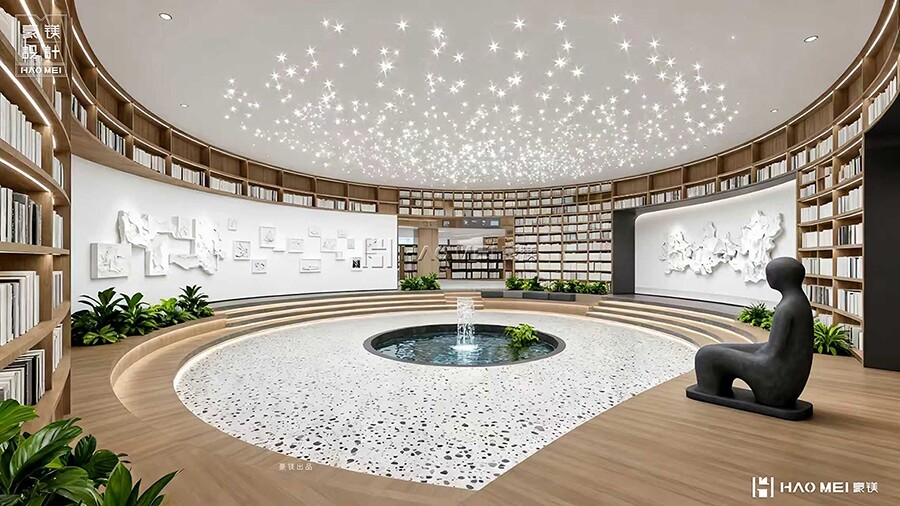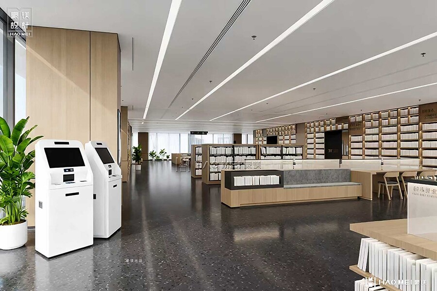 图书馆不仅是知识仓库,更是美育课堂。第10图的中央水池与星空顶灯,以艺术装置激发想象力;第4图的电子查询屏与自助终端(第6图)则体现科技赋能的高效服务。豪镁通过“隐形设计”将科技融入环境,如嵌入式灯光系统、智能导览等,让读者聚焦内容而非工具本身。