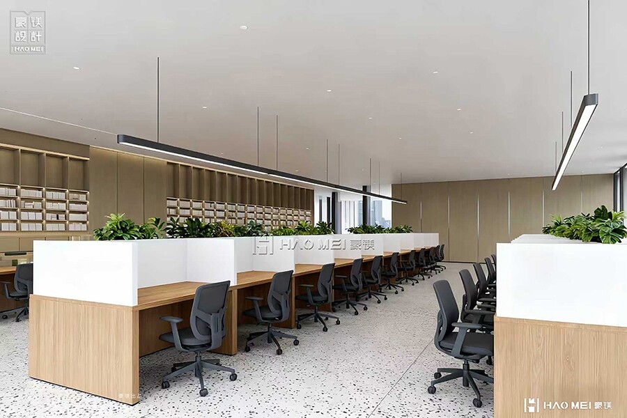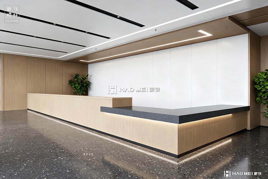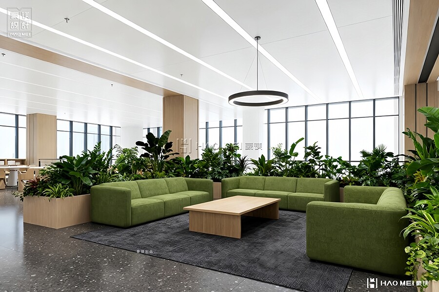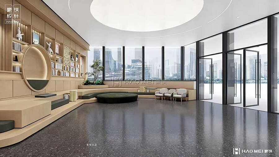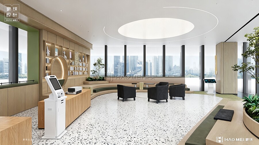 豪镁坚持“少即是多”的简约美学,以木色、灰色、墨绿为主色调(如第4、5、7图),通过材质碰撞传递温度。木质书架与石材地面形成冷暖平衡,墨绿沙发(第3图)与绿植呼应,在沉稳中注入生机。细节上,弧形家具(第8图前台)、镂空墙面(第2图)等设计减少空间压迫感,彰显“以人为本”的细腻考量。