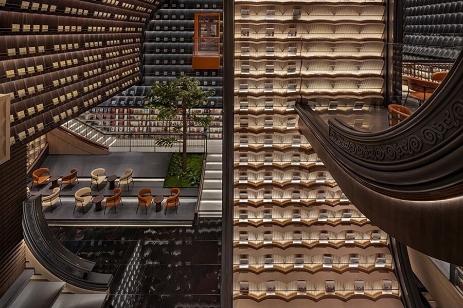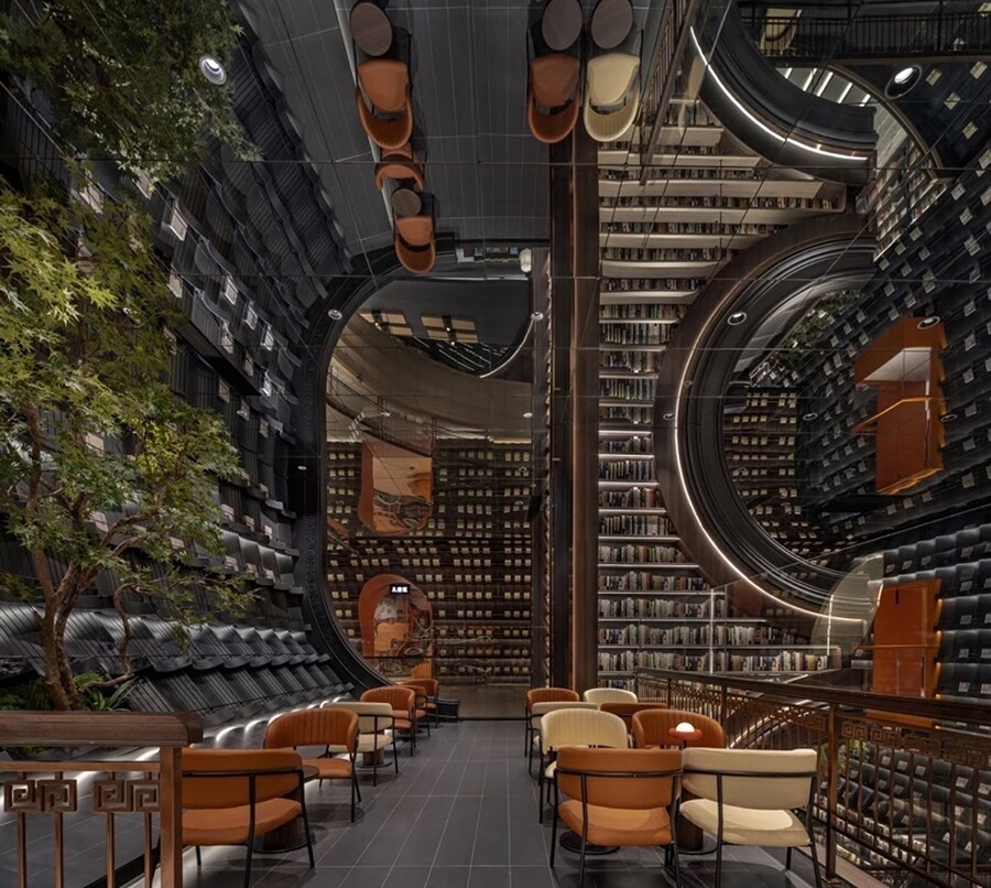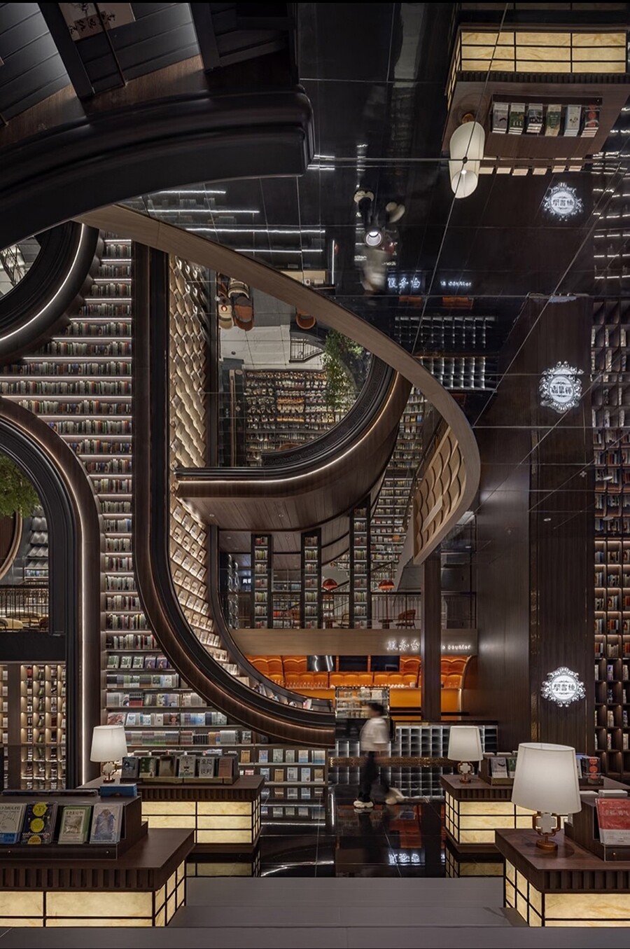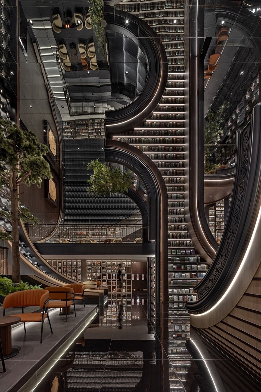 特别值得一书的是那座标志性的黑色螺旋楼梯(图4、图8)。它不仅是连接不同楼层的通道,更是一座视觉雕塑,一个连接古今的时空隧道。木质扶手与黑色台阶的搭配,在流畅曲线中蕴藏着力量感。当读者拾级而上,俯视层层叠叠的书架穹顶(图6),或仰望镜中无限的递归影像,仿佛完成了一场从具象到抽象、从有限到无限的精神攀升。