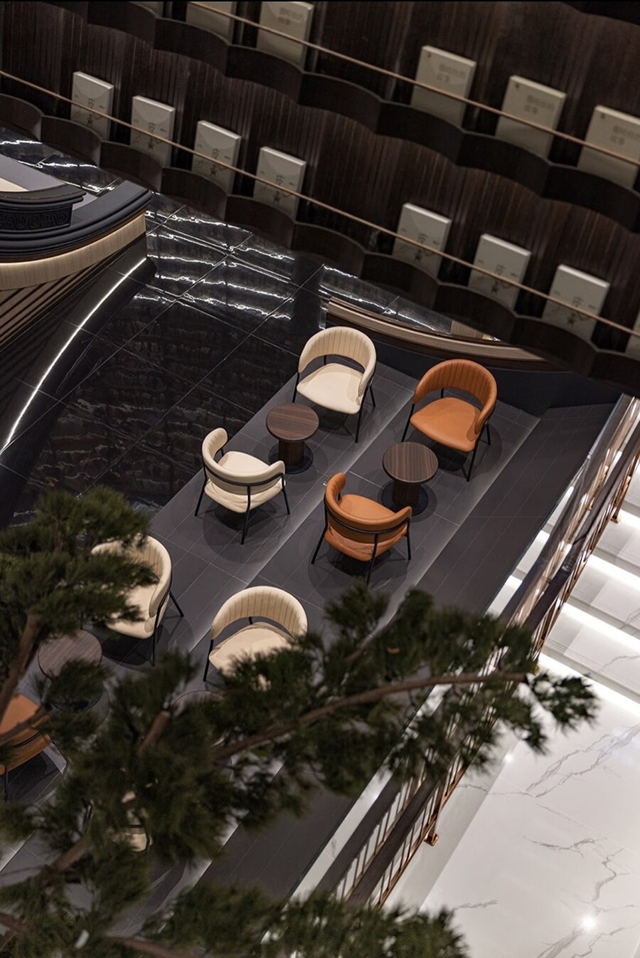 入口处,一道弧形的坡屋顶式拱门缓缓展开(如图5、图7所示),如同掀开了一本巨著的扉页。这并非对传统屋顶的简单复制,而是以现代极简的曲线,抽象出古建屋顶的轮廓。设计师摒弃了繁复的装饰,仅以一道干净的弧线,便勾勒出家的意向、聚落的温暖,以及一种欢迎的姿态。