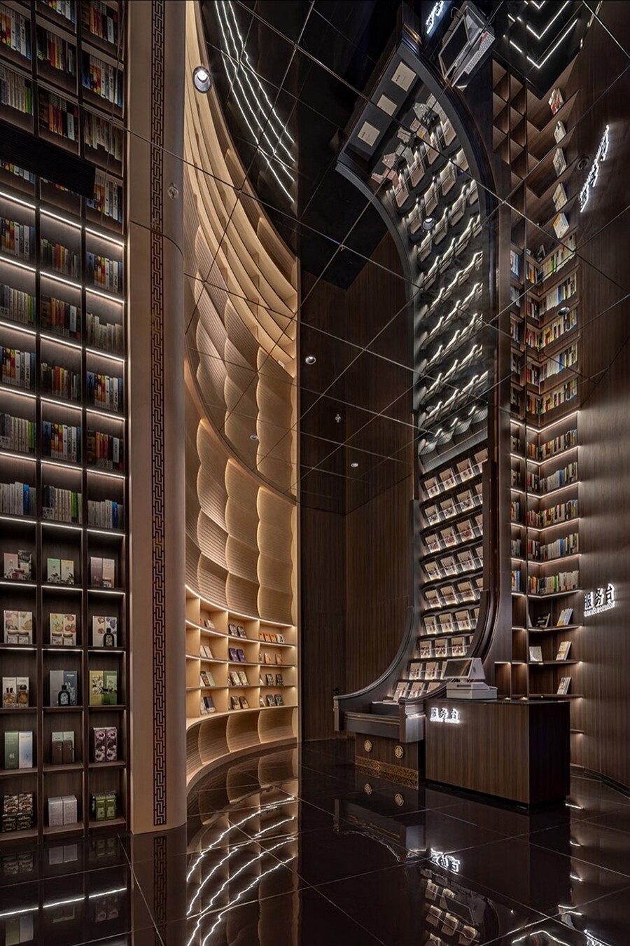 而最令人拍案的设计,出现在书店的中心区域(图5、图10)。现实中的书架与天花板上的镜面形成无限反射,构造出一个无穷递归的莫比乌斯环。读者站立其间,仿佛置身于一个没有起止的知识宇宙。书架向上生长,又在镜像中向下延伸,彻底模糊了天与地、现实与虚幻的界限。这一刻,你不仅是在读书,更是在阅读空间本身,阅读“无限”的概念。