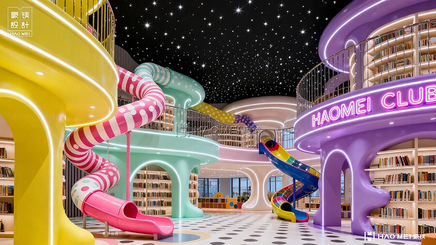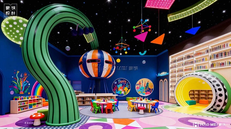 星芽童书堡的落成,是豪镁设计对“儿童友好型空间”理念的一次深度实践。我们深知,设计的力量不在于堆砌造型与色彩,而在于真正理解儿童的天性与需求,并用专业能力将其转化为他们喜爱并乐于使用的环境。当看到孩子们在星空下滑梯上绽放笑容,在蘑菇座椅上沉浸书海,在彩色书架间穿梭探索时,我们相信,我们已经成功地将一颗名为“阅读”的星辰,种在了他们心中,静待其萌芽、生长,终成参天大树。