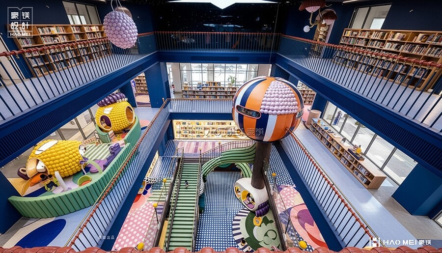 滑梯与书山的结合:将令人兴奋的大型螺旋滑梯、热气球滑梯融入空间,使其不仅是娱乐设施,更是连接不同阅读区域的动线纽带,鼓励孩子们在“翻越书山”后享受“滑行”的乐趣。