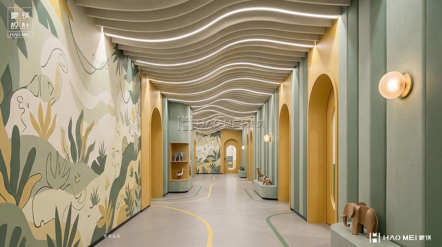 场景的沉浸感则渗透于空间的每一处细节。入口接待区采用流畅的弧形设计,不仅消除了所有尖锐边角,确保了绝对的安全,更以柔和的形态欢迎每一位小访客。旁边伫立着造型可爱的长颈鹿与恐龙木质玩偶,仿佛来自童话世界的使者,邀请孩子们即刻开启一段奇妙的旅程。墙面不再是单调的留白,而是化身为一幅幅生动的故事画卷:郁郁葱葱的森林、憨态可掬的动物、遥远的星球与飞船……这些手绘艺术墙面,不仅是装饰,更是无声的故事讲述者,极大地激发了孩子们的好奇心与想象力。蜿蜒的路径引导着孩子们的脚步,拱形的门洞如同通往神秘世界的入口,整个空间就如同一个立体的、可触摸的巨型绘本,等待孩子们去阅读、去探索。