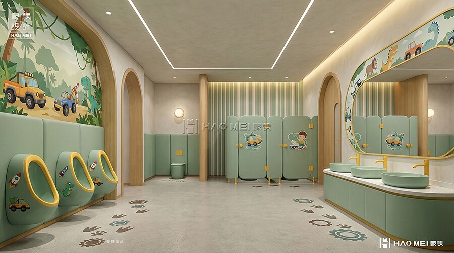 • 专属关怀与细节呵护区: 我们尤其注重儿童专属空间的贴心设计。卫生间区域完全以儿童的尺度进行打造,洁具、洗手台都符合儿童的身高。墙面装饰以活泼的卡通主题图案,将日常必需的生活环节也变得充满趣味。同时,该区域同样贯彻了最高标准的安全设计,确保孩子们即使在独立使用时也能得到周全保护。
