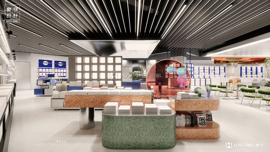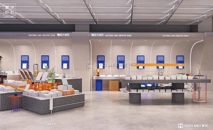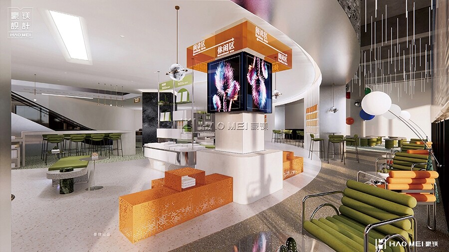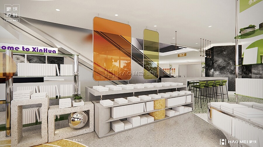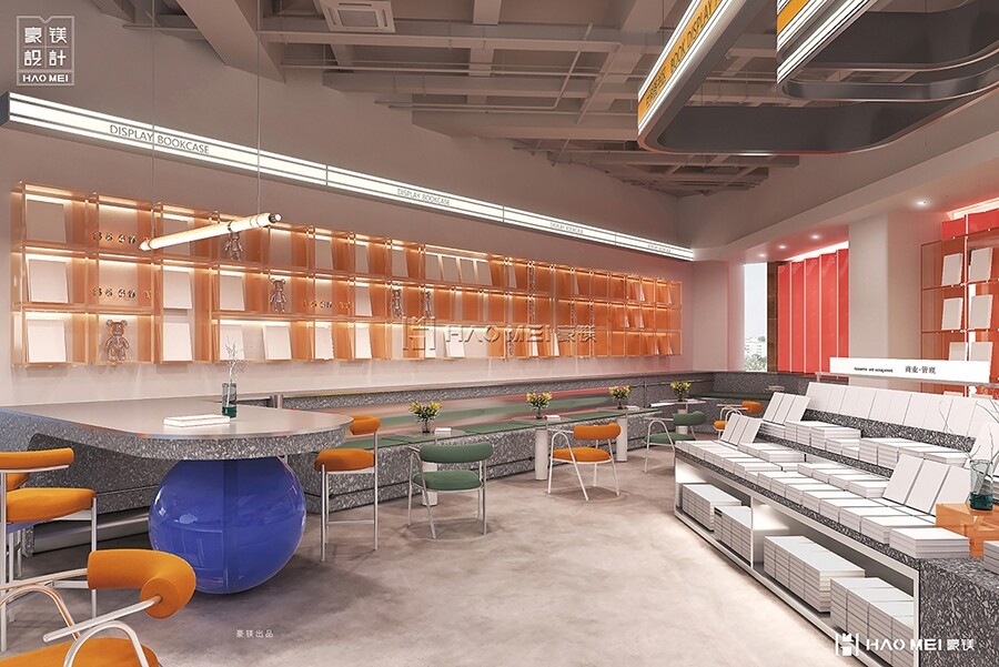色彩与美学叙事: 效果图显示,空间以白、灰为基底,大胆运用橙色、绿色等亮色作为点缀,既保持了文化空间的简约高级感,又注入了活力与时尚气息。
