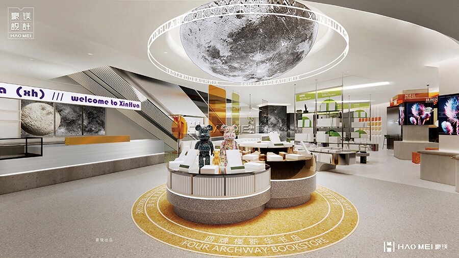 书店入口是品牌与顾客的第一次“对话”,必须清晰有力。效果图中可见,我们采用开放、通透的入口设计,视觉上直接将店内充满生机与美学的场景呈现给路人。入口核心区域设置主题聚宝盆——一个如效果图里带有巨型月球装饰或醒目品牌标识的中央展台。这里集中陈列当季畅销书籍、与热门影视联动的IP图书、以及最具话题性的高端文创。通过多媒体屏幕、主题堆头和精致的灯光,瞬间抓住顾客注意力,传递出书店“时尚、前沿、有料”的鲜明调性,实现“30秒内吸引入店”的关键目标。