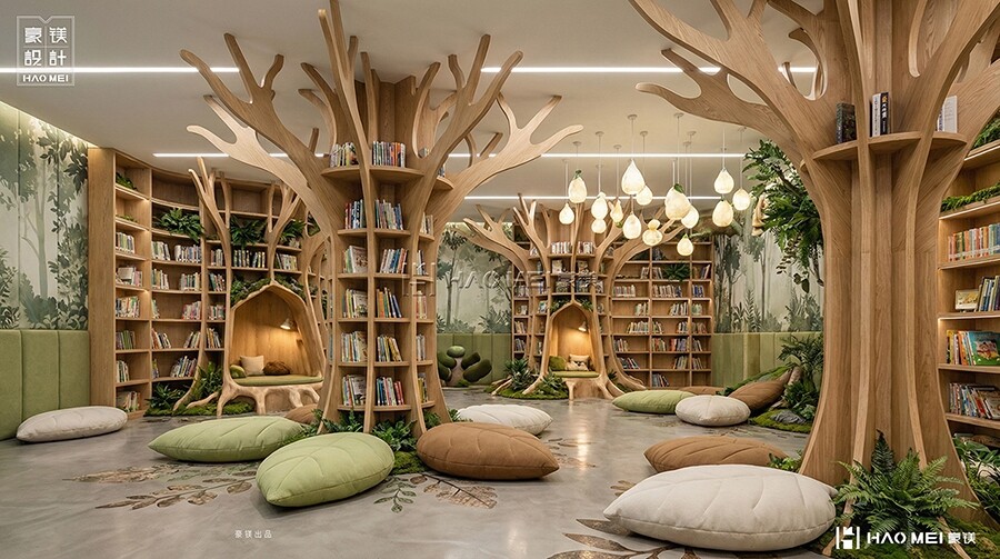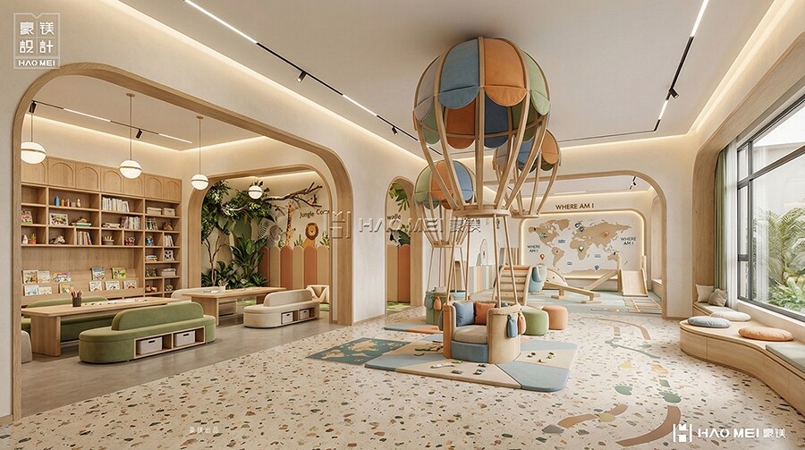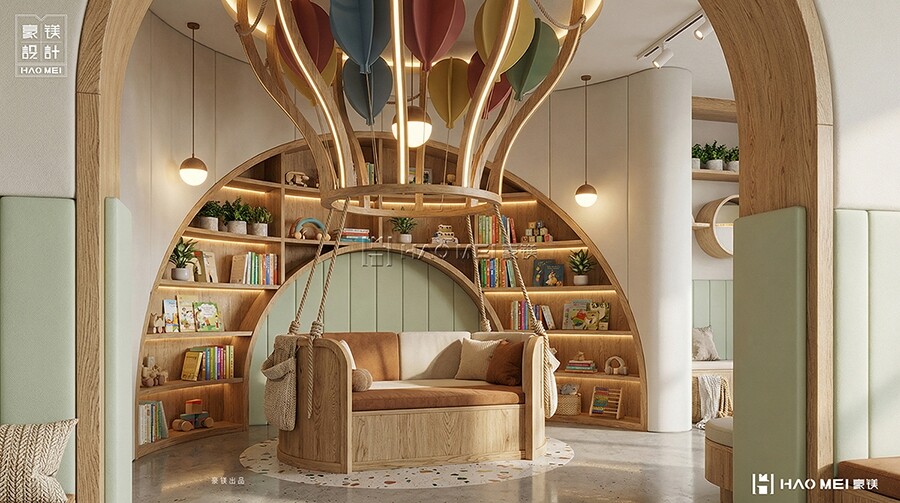 亲子空间的本质,是创造“父母不缺席的成长时刻”。豪镁设计深谙此道,在空间布局中植入多重“陪伴触点”:一组长方形木质餐桌搭配浅绿座椅,让家长与孩子在共餐中自然对话;临窗设置的弧形木质长椅旁,落地窗前铺陈着爬行垫,家长可倚坐翻书,孩子的每一次探索都在视线可及处,目光与温度始终交织成网。尤为动人的是树形书架装置——粗壮树干化作书架主干,树枝末端延伸为层板陈列书籍,底部嵌入式阅读角铺着软垫靠枕,家长与孩子蜷坐“林间小屋”,指尖划过书页的沙沙声与枝叶光影的流动,构成最本真的陪伴注脚。即便是中心区域的悬挂式木质吊椅(形似热气球),也以环绕的彩色装饰与周边书架形成“守护式布局”,让孩子的每一次摇晃都有父母的目光温柔托底,陪伴不再是“旁观”,而是“共在场”。