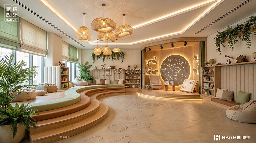 儿童空间的设计难点,在于平衡趣味性与功能性。豪镁设计以“隐性引导”破题:墙面以世界地图装饰画与植物墙绘相映,在潜移默化中启蒙认知;发光星座图配动物剪影墙以梦幻光影激发探索欲;两排木质长桌上的标本展示与背景墙的大型生态鱼缸,则将科学观察融入日常——家长与孩子可围坐协作观察标本、投喂小鱼,在互动中解锁自然奥秘。动线设计同样暗藏巧思:彩色地面线条如蜿蜒小路,自然引导探索路径;拱门分隔功能区却不阻断视线,既保证安全又维持空间通透。就连地面的卡通脚印、树叶地贴,也成了“会说话的向导”,让规则意识在游戏中悄然生根。
