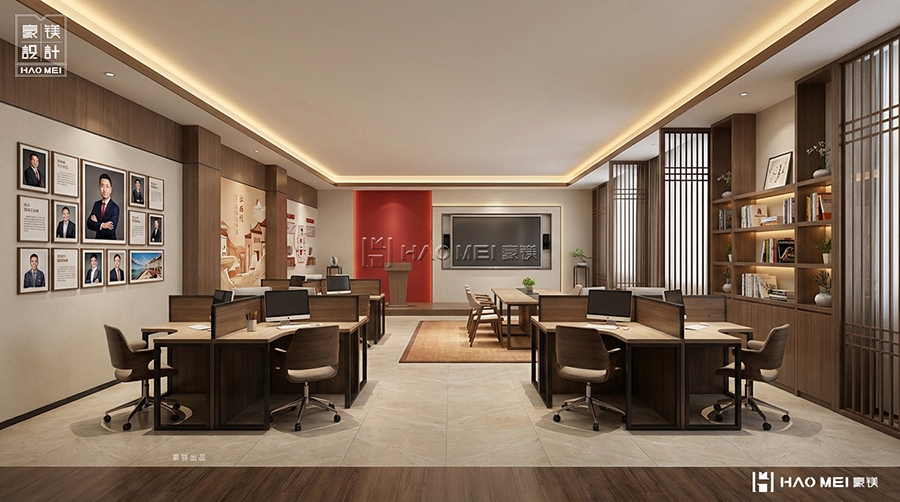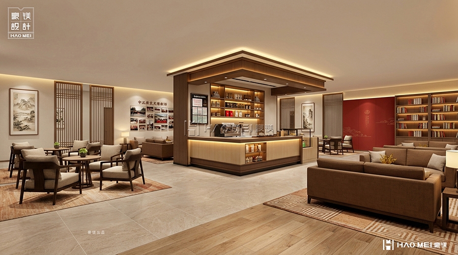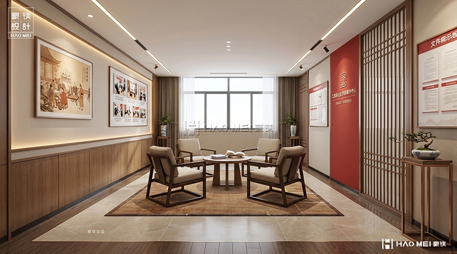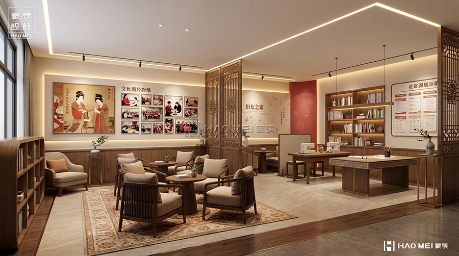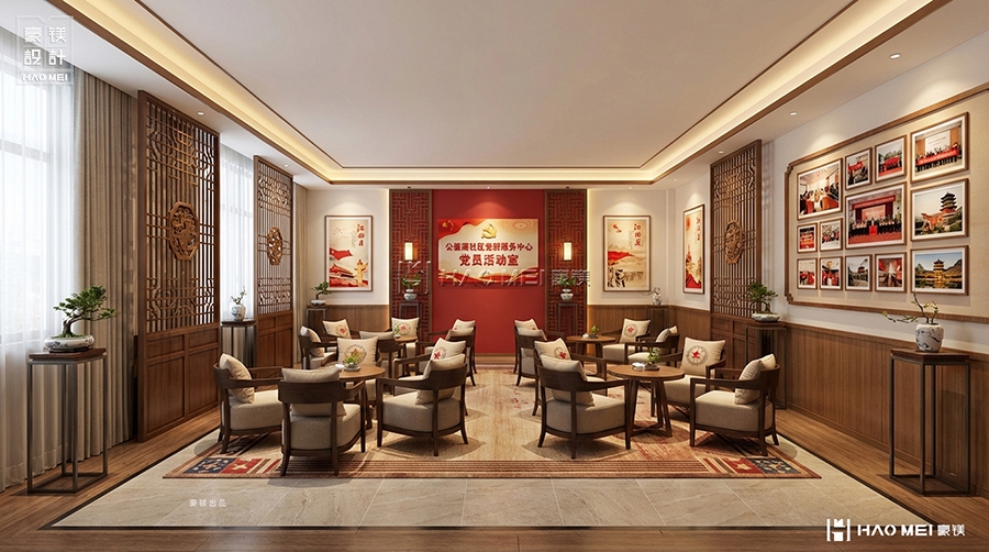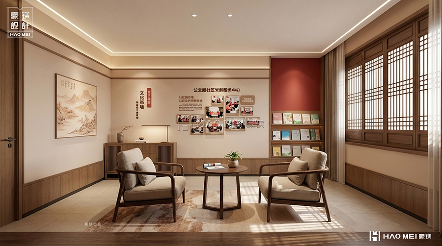 在新时代背景下,基层党建与社区文化建设不断深化,党群服务中心作为服务群众的重要载体,其空间设计与功能布局至关重要。豪镁设计公司有幸为宫保地党群服务中心打造党建书吧阅览室,以“红色文化、温馨阅读、社区共享”为核心理念,创造出一个集党建教育、阅读交流、文化展示于一体的多功能空间。通过巧妙的空间布局、中式元素的现代演绎和人性化细节,我们致力于将党建书吧阅览室打造成既有政治高度、又有文化温度的社区精神家园。