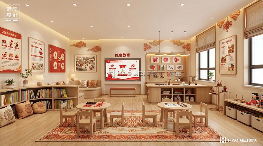 宫保地党群服务中心党建书吧阅览室的设计,是豪镁设计对新时代党建空间的一次探索。我们相信,党建空间不仅是开展组织生活的场所,更是凝聚社区共识、培育文化自信、服务居民需求的重要平台。通过将红色基因、文化传承与社区生活有机结合,我们创造了一个有温度、有深度、有活力的公共空间。