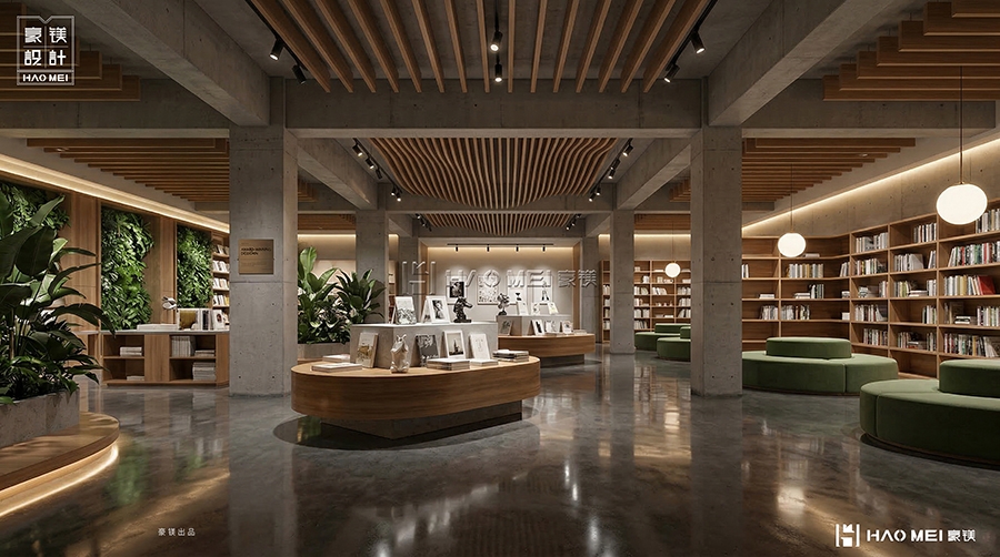 在数字化浪潮席卷阅读场景的当下,“书店”早已超越“售书场所”的单一属性,成为文化传承、社交互动、精神栖居的复合载体。豪镁设计接手“乐知书店”项目时,便锚定“让空间成为知识的容器、情感的纽带、城市的会客厅”这一核心命题,以“工业质感×自然生机×人文温度”为设计母题,在1200㎡的空间里,编织出兼具商业活力与文化深度的阅读生态。