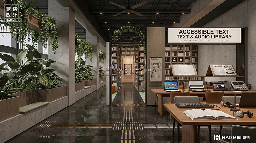• 主题化分区:设置“Accessible Text & Audio Library(有声书专区)”“经典文库”“在地文化角”等细分区域,通过标识系统、家具形态(如弧形书架、矮柜)实现功能区分,满足“深读、听书、社交”等多元需求。