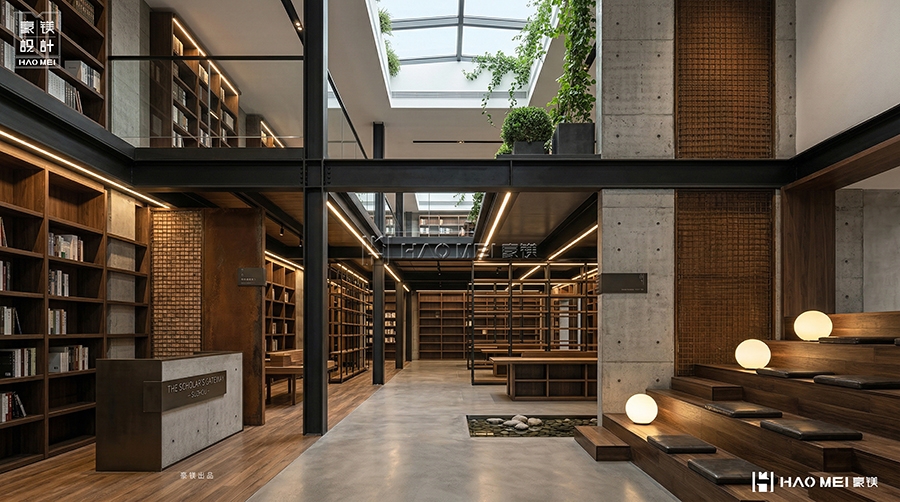 豪镁设计在规划吾筑书局时,摒弃了传统书店“货架+收银台”的线性思维,转而采用“庭院式动线”与“沉浸式分区”策略。整个空间以“书廊—书阶—书庭—书阁”层层递进,形成一条富有节奏感的文化游径。高耸的深木色书墙如古寺经阁般庄严,与裸露的混凝土柱、黑色钢构梁形成强烈材质对比,既保留了工业风的现代感,又注入了东方建筑的沉稳气韵。
