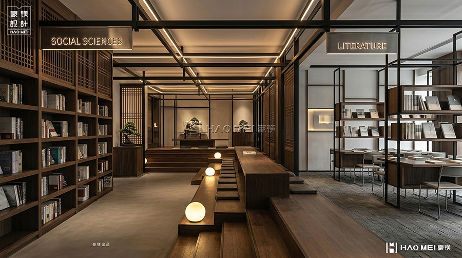 灯光设计是豪镁设计的核心亮点。我们以“线性灯带+点光源”组合,勾勒空间轮廓,突出书脊与展品。暖黄光球如月光般散落于台阶与展台,营造静谧氛围;重点照明聚焦书籍与艺术装置,引导视线焦点。整体光环境遵循“明暗有致、虚实相生”的东方审美,让读者在光影交错中感受阅读的静谧与深邃。