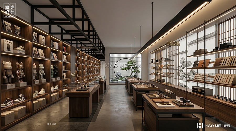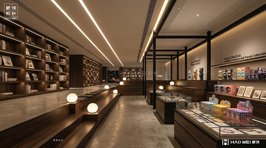 特别设置的“Collectibles & Stationery”区,将文具、潮玩、文创产品以博物馆展陈方式陈列,使消费行为升华为文化收藏。豪镁设计在此巧妙运用“展示性收纳”理念,让商品成为空间叙事的一部分,而非单纯售卖对象。