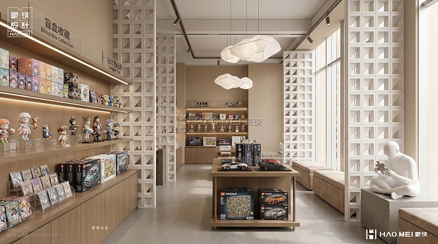 • 文创与美学体验区:在右侧区域(如图5),我们打造了“盲盒收藏”与文创手办展示区。通过玻璃展柜与重点照明,将文创产品转化为艺术品展示,不仅打破了单一的购书体验,更吸引了年轻客群,实现了“淘宝式”的探索乐趣。
