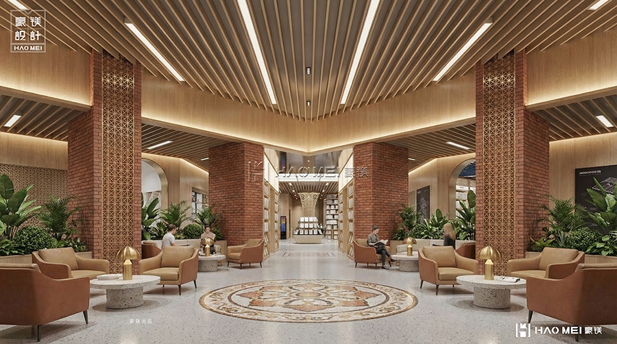 • 大厅休闲区(图4):以“圆形地毯+弧形沙发”构建社交核心,红砖柱体的镂空雕花(提取金川民俗图案)与木质地面的几何拼花呼应,绿植点缀增添生机;这里是市民“停留、交流、观展”的过渡空间,让阅读从“个体行为”转向“群体互动”。