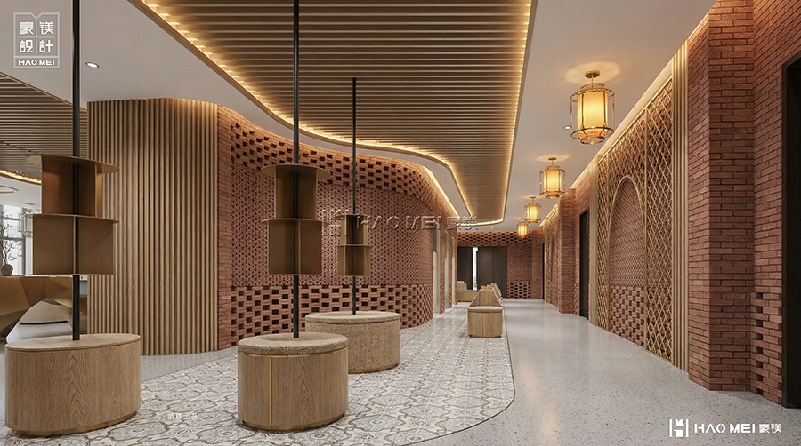 • 红砖:通过“整砖砌筑+局部镂空雕花”工艺,保留红砖的厚重质感,同时以现代手法重构传统砖雕,让历史记忆“可视化”。
