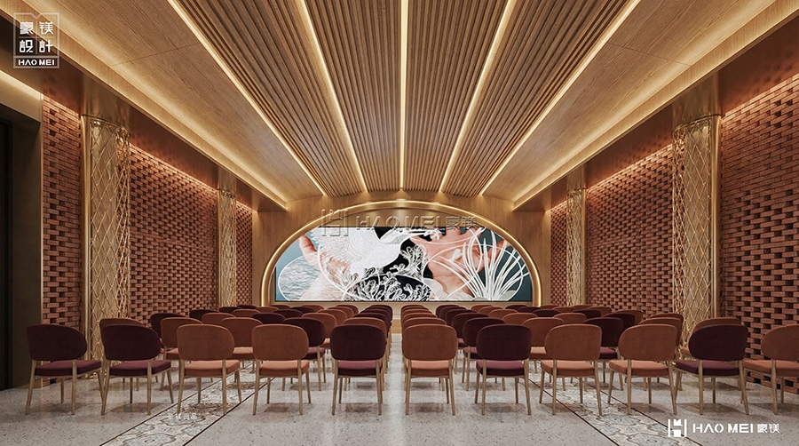 • 报告厅/活动室(图6):弧形穹顶与线性灯光营造“舞台感”,红砖墙面做吸音处理,同时满足声学需求;座椅的暖棕色调与整体风格统一,可适配讲座、演出、培训等多元活动。