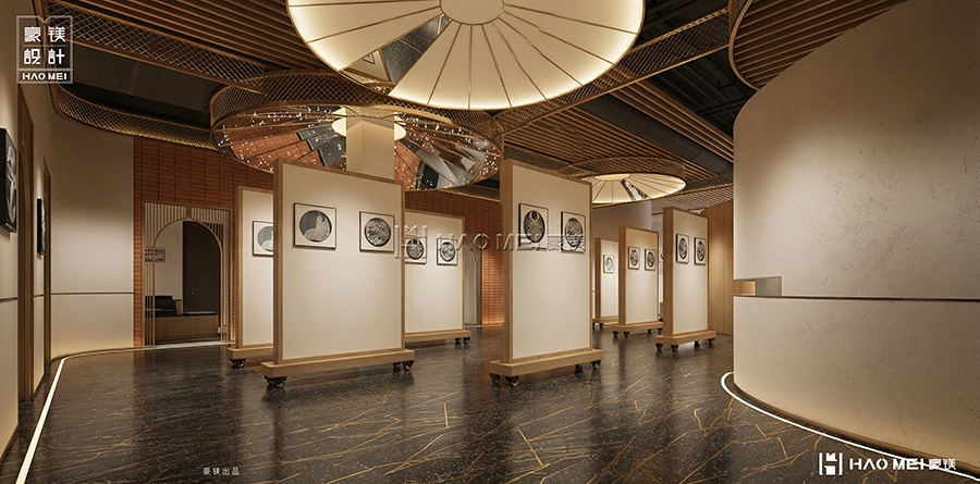 • 展览区(图7):可移动展板结合轨道灯,实现“艺术展、文化展”的灵活布展;地面的黑色石材与金色线条,借由光影对比突出展品;天花板的“伞状灯”呼应传统建筑的檐角意象,让展览空间兼具“艺术感”与“在地性”。