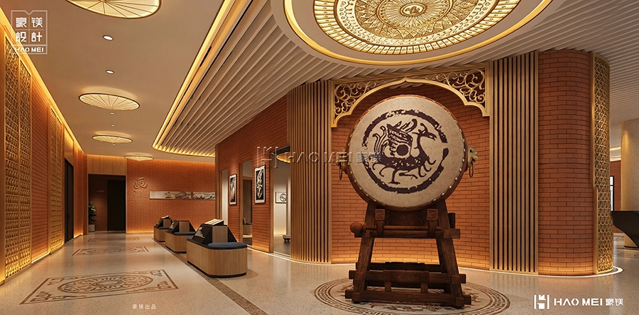 • 走廊文化区(图5、图8):图5的“悬挂式书架+圆形坐凳”,将阅读节点嵌入动线,打造“移动阅读角”;图8的“文化鼓装置+弧形吊顶”,以传统鼓纹为视觉焦点,结合地面拼花与墙面雕花,成为“文化打卡地”,让走廊从“交通空间”升级为“文化展示带”。