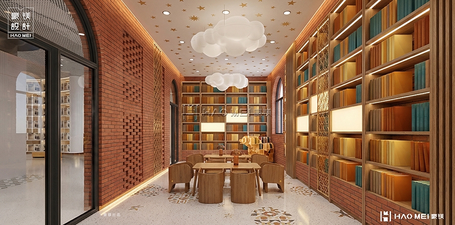 • 少儿阅读区(图9):以“星空与童话”为主题,天花板嵌入星星灯,红砖墙面做趣味化镂空造型,搭配云朵灯与低矮书架,营造“探索式阅读”场景;色彩选用柔和的木色、暖黄与马卡龙色,激发儿童想象力。